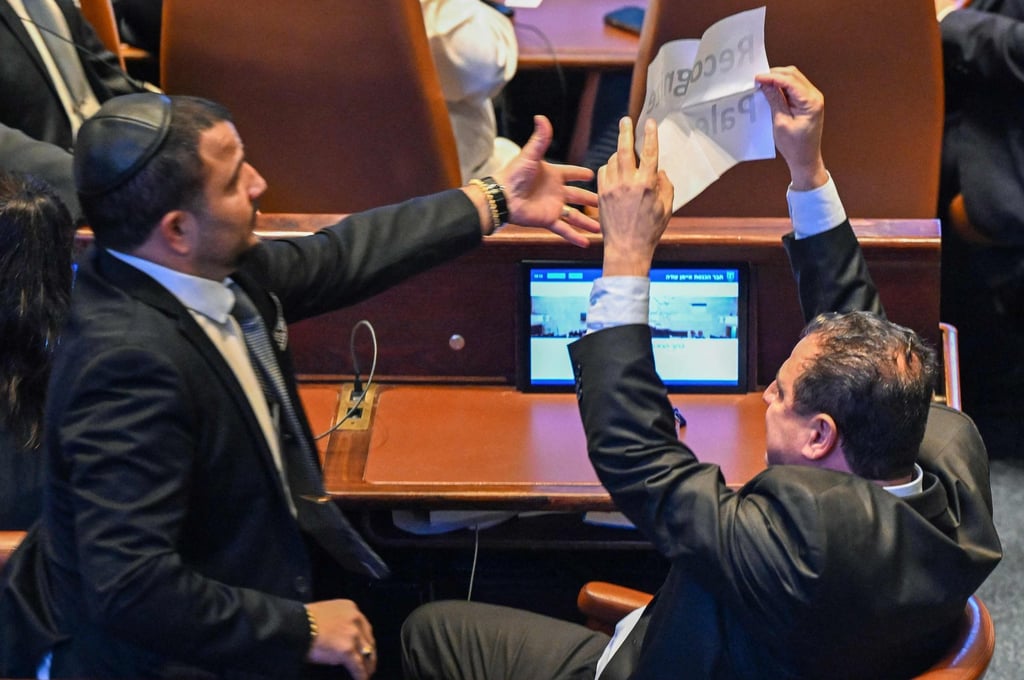 Израелският член на Кнесета Айман Одех държи табела с надпис „Признайте Палестина“ по време на речта на президента Доналд Тръмп в израелския парламент в понеделник. Снимка: AFP