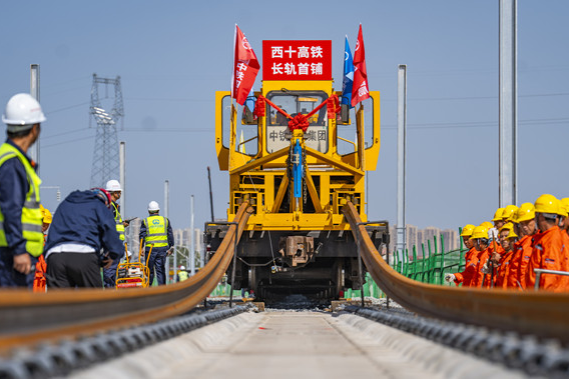 Китайските железопътни строители започват да полагат коловози на 8 септември по високоскоростния железопътен маршрут Xi’an-Shiyan, разширявайки високоскоростната железопътна мрежа в страната. [Photo by ZHAO MENGTING/for chinadaily.com.cn]