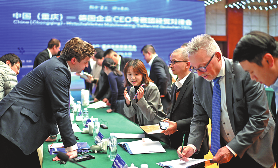 Представители на китайски и германски предприятия обменят идеи по време на посещението на германска делегация от главен изпълнителен директор в Чунцин по-рано тази седмица. HE PENGLEI / CHINA NEWS SERVICE