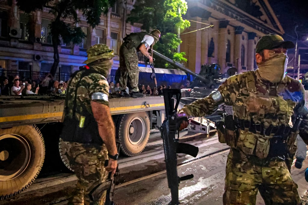 Членове на руската група Вагнер охраняват район, докато други товарят танк на камион в Ростов на Дон, Русия, на 24 юни 2023 г., по време на прекратеното въстание на групата срещу Москва. Наемниците са активни във войната в Украйна. Снимка: APЧленове на руската група Вагнер охраняват район, докато други товарят танк на камион в Ростов на Дон, Русия, на 24 юни 2023 г., по време на прекратеното въстание на групата срещу Москва. Наемниците са активни във войната в Украйна. Снимка: AP