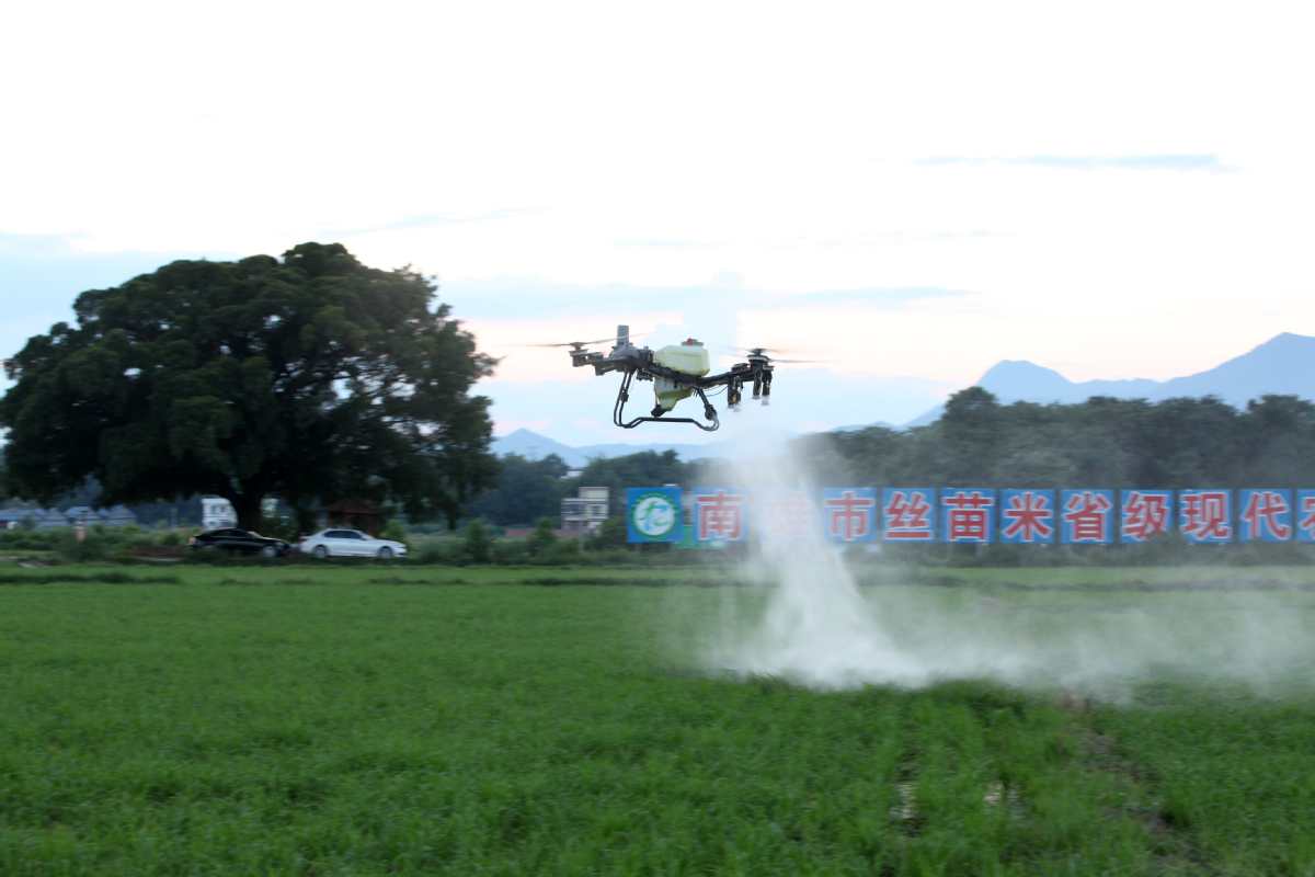 Селскостопански дрон пръска течност над оризово поле през август 2025 г. в Nanxiong, град на ниво окръг в северната провинция Гуангдонг. [Photo by Qiu Quanlin/chinadaily.com.cn]