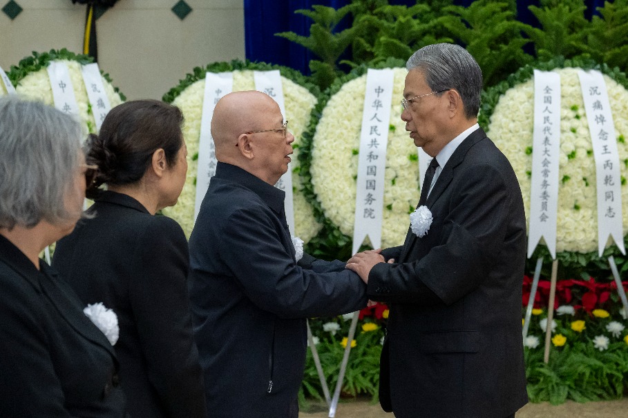 Джао, член на Постоянния комитет на Политическото бюро на Централния комитет на Комунистическата партия на Китай и председател на Постоянния комитет на NPC, заедно с други, се сбогуват с Уанг в погребалния дом в Гуанджоу.