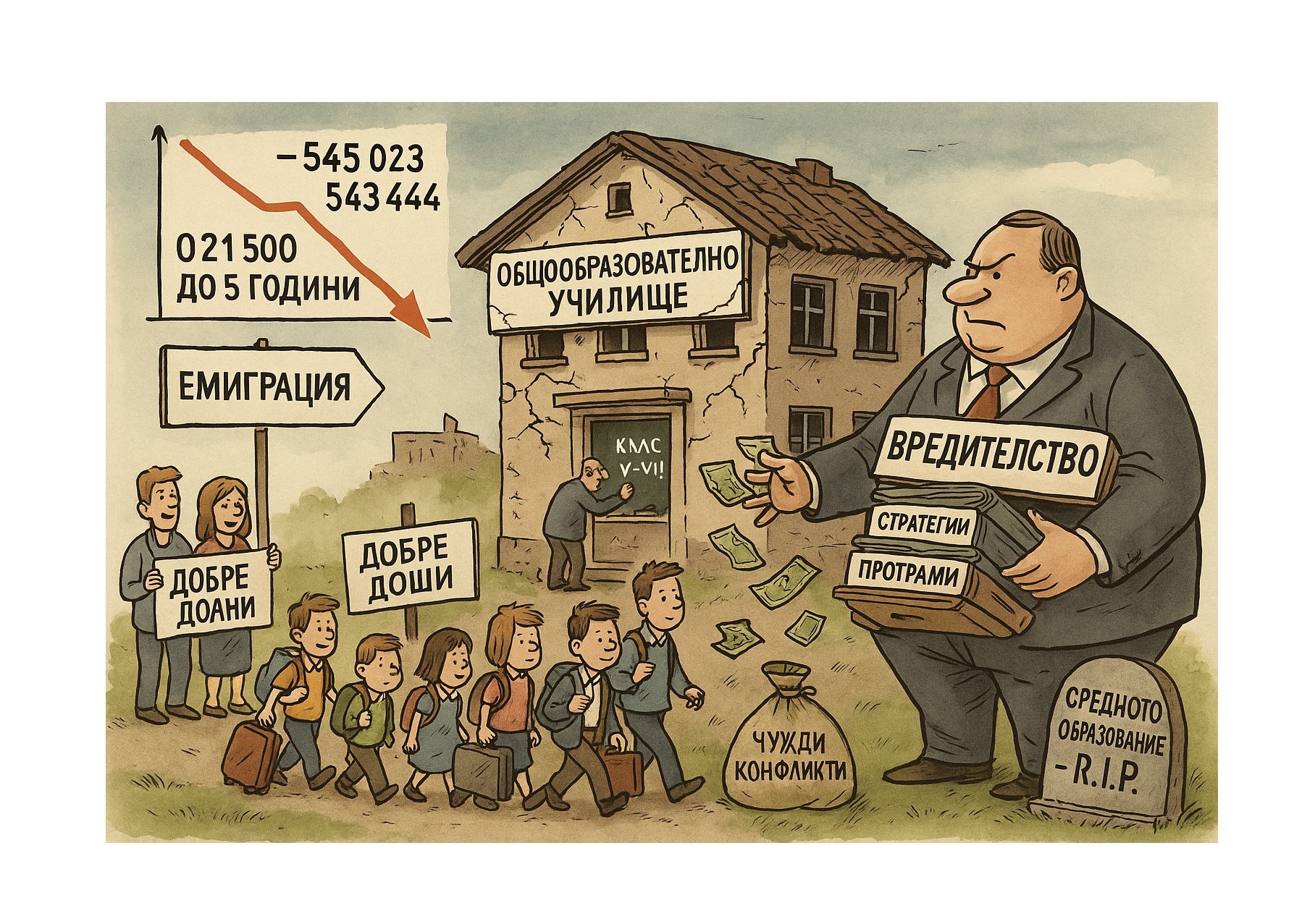 3. ВРЕДИТЕЛСТВОТО бездейства, докато училища в малките населени места се затварят, класните стаи се обезлюдяват, а учителският недостиг става хроничен. Всяка година десетки хиляди деца отпадат от системата, а държавата не предприема решителни мерки да ги върне.