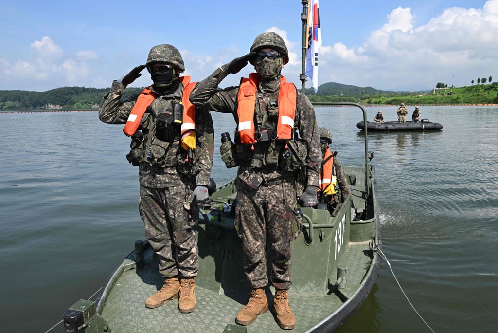 Южнокорейските войници поздравяват лодка, свързана с плаващ мост по време на съвместна тренировка за кръстосване на реката в Южна Корея, като част от годишното военно упражнение на Ulchi Freedom Shield в Йеоджу на 27 август. Снимка: AFP Лий също подчерта, че Южна Корея все още имаше 2,6 милиона обучени резервисти, изразходвани повече от 1,4 пъти Северна КореяБрутният вътрешен продукт ежегодно по отбрана и се класира на пето място в световен мащаб във военната власт.