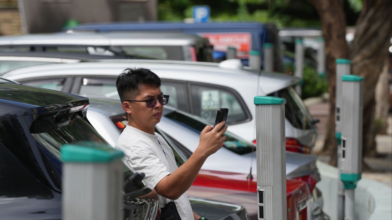 Десет превозни средства, включително две таксита, на опашка за дозираните паркоместа на улица „Хинг Фат“ близо до парк Виктория в залива на Каусуей в неделя следобед.