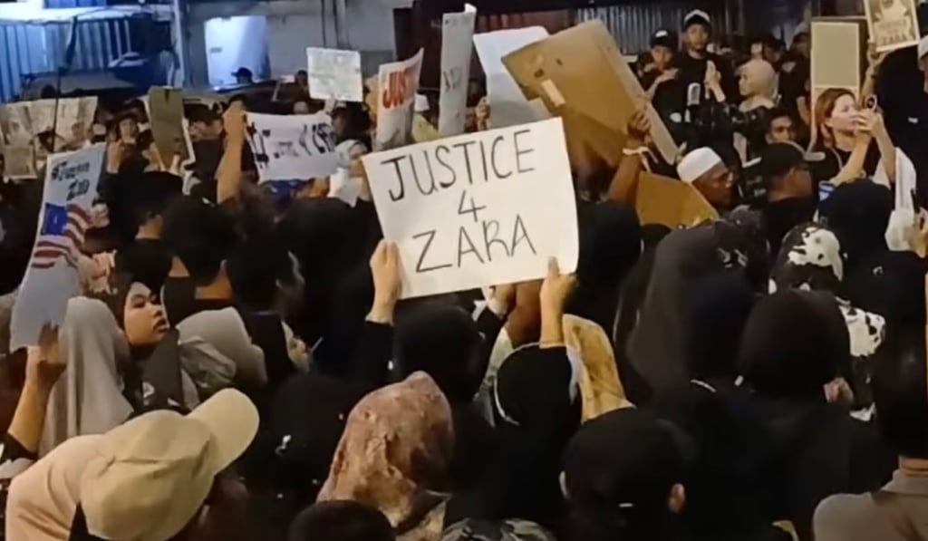 Протестиращи се събраха на нощен пазар в Сабах, Малайзия, на 8 август, за да поискат справедливост за смъртта на 13-годишната Зара Кайрина Махатхир. Снимка: YouTube/Malindo TV