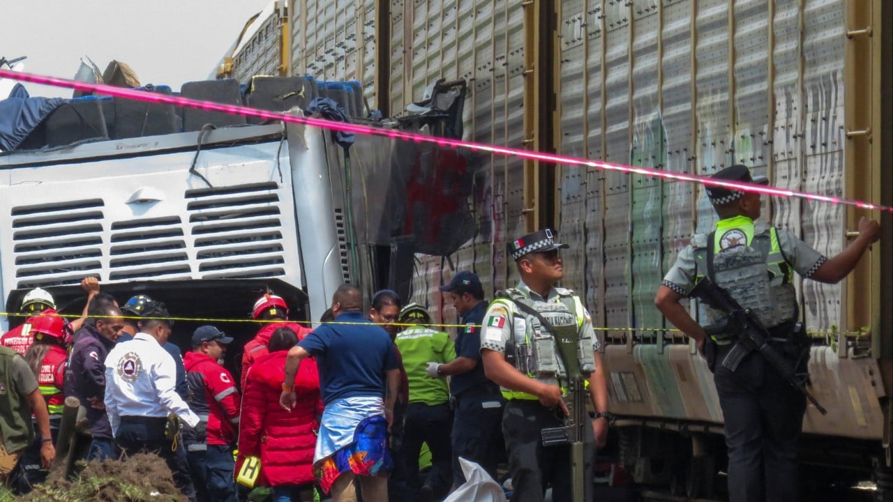 Влакът с стоки се заби в автобус с двойна палуба северозападно от Мексико Сити в началото на понеделник, убивайки поне осем души и рани 45, съобщиха властите.